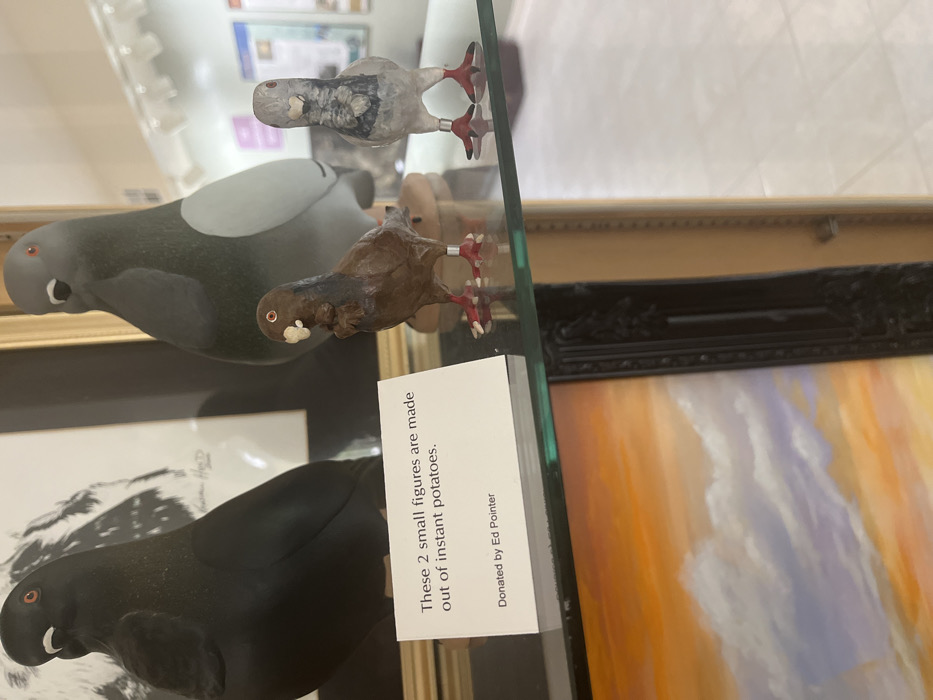 The image depicts an indoor museum display featuring various pigeon figures. In the foreground, on a clear glass shelf, are two small, hand-crafted pigeon figures: one brown on the left and one light gray on the right. Both small figures feature red feet and silver leg bands. A white rectangular sign on the glass shelf states, "These 2 small figures are made out of instant potatoes. Donated by Ed Pointer." Behind the glass shelf, two larger pigeon sculptures are visible: a solid black one on the left facing left, and a gray and white one on the right facing right. A framed black and white artwork is partially visible behind the black figure. Below the glass shelf, a portion of a framed painting, depicting a sky with orange and purple clouds, is visible. The background shows blurred elements consistent with a museum or gallery setting, including informational posters on walls. The scene is located at the American Racing Pigeon Union Hall of Fame Museum in Oklahoma City, Oklahoma, United States. No people are visible, and the scene is static.