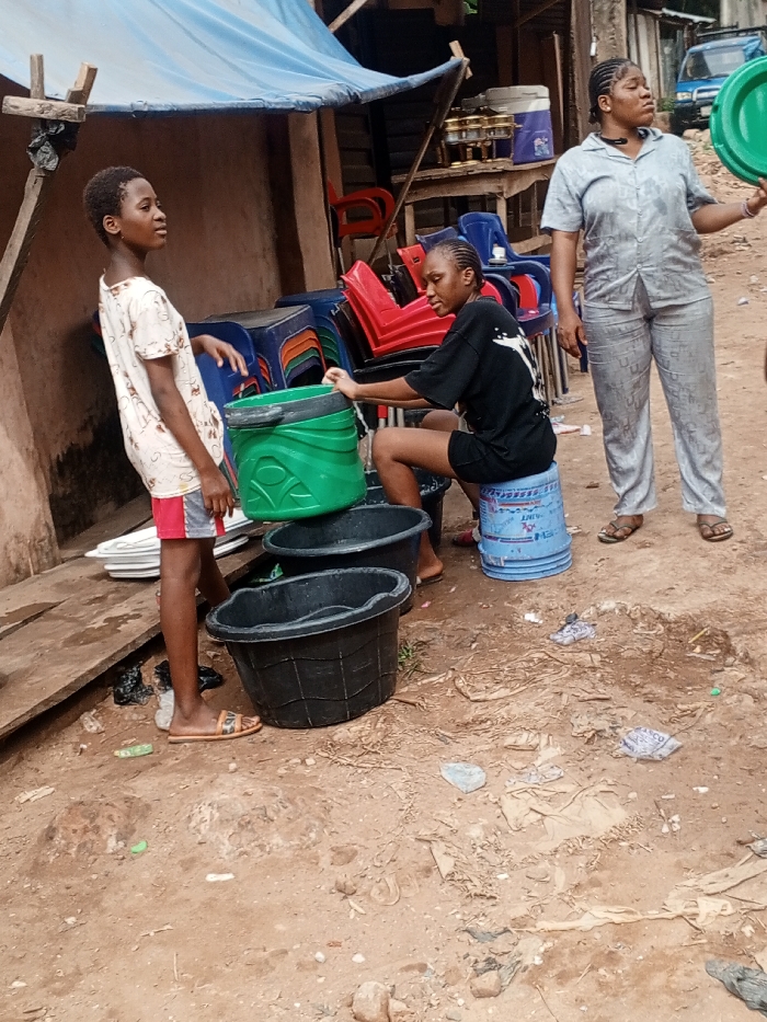 The image depicts an outdoor scene in Onitsha, Nigeria, featuring three individuals and various objects suggestive of a commercial or domestic setup. To the left, a young individual with short, dark hair stands in profile, facing left, wearing a light-colored patterned short-sleeved top, red and white striped shorts, and tan slide sandals. Their right hand rests near a black plastic basin. In the center, a second individual with braided dark hair is seated on an overturned blue plastic bucket, wearing a black t-shirt with a white graphic design and black shorts. This person is actively handling a green plastic bucket positioned above two black plastic tubs, which are stacked on the reddish-brown earth. To the right, a third individual with dark hair stands, looking slightly upwards and to the right, wearing a light grey patterned short-sleeved shirt and matching trousers, with brown sandals. They hold a circular green lid in their left hand. Behind the individuals, a makeshift stall structure is visible, supported by wooden poles and covered by a light blue tarp. Underneath the tarp, numerous stacked plastic chairs (red, blue, and black) are present, alongside what appears to be a counter holding various containers. To the far upper right, a partial view of a blue vehicle is visible. On the ground to the left, a stack of white plates rests on a wooden plank. The foreground and ground surface consist of unpaved, reddish-brown earth, uneven and littered with small rocks, crumpled plastic, and other debris.