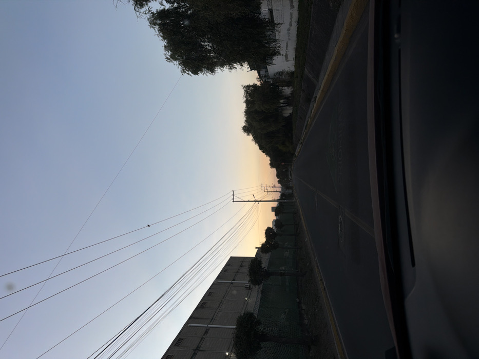 A street view from a vehicle at dusk. The road stretches forward with a yellow stripe on the curb. Buildings line the left, including a tall, gray structure. Power lines crisscross the sky, and a bird sits on one. Trees grow along both sides of the street. The sky fades from blue to a pale orange near the horizon. The right side of the frame is dark, presumably part of the vehicle's interior.