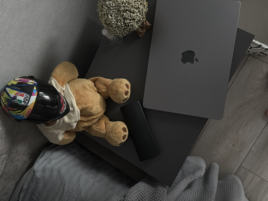 The image displays an indoor scene within a residence in Khimki, Russia. A brown plush teddy bear, wearing a light-colored t-shirt, is seated upright on a dark gray rectangular nightstand. A miniature, multi-colored motorcycle helmet, featuring an AGV logo and a dark visor, is positioned on the teddy bear's head. To the left of the teddy bear, a black rectangular object, resembling a case or wallet, rests on the nightstand. To the right, a closed silver/space gray Apple MacBook laptop is present, partially overlapping the nightstand's edge. In the upper right portion of the nightstand, a small decorative spherical object with a textured, possibly plant-like surface, is visible alongside a clear bottle equipped with a pump dispenser. Light gray textured bedding or a blanket is visible on the left side of the image, adjacent to the nightstand. The background features a plain light gray wall, and the lower foreground reveals light-toned wooden or laminate flooring.