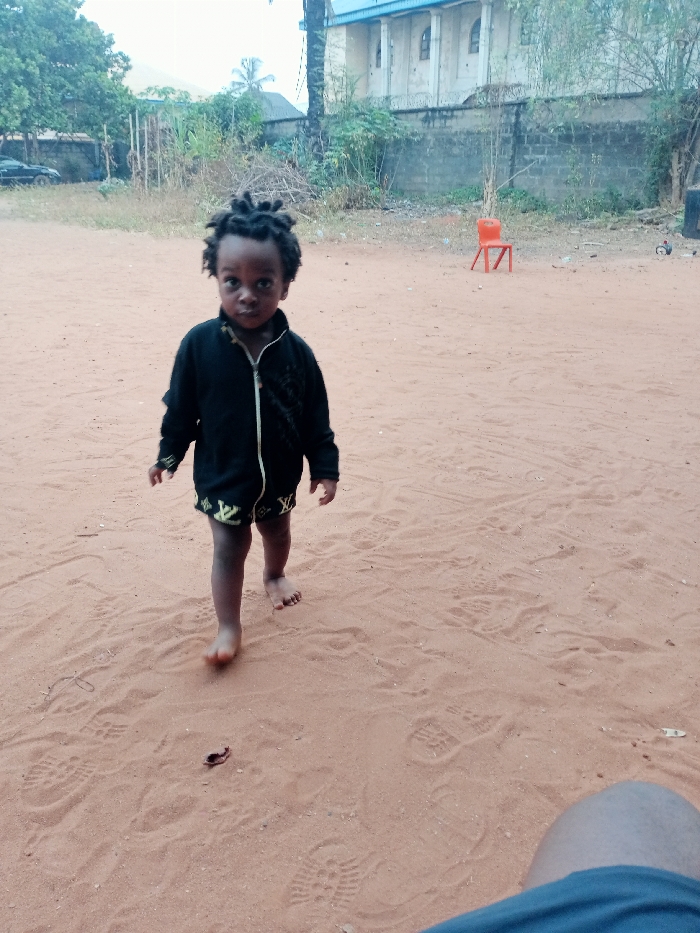 A young child with dreadlocks walks barefoot on a sandy ground. The child wears a black zip-up jacket and patterned shorts. In the background, a building, vegetation, a fence, and a lone orange chair are visible. The ground shows numerous footprints. A small, dark object lies on the sand near the child. The lower right corner includes a glimpse of someone's leg in blue clothing.