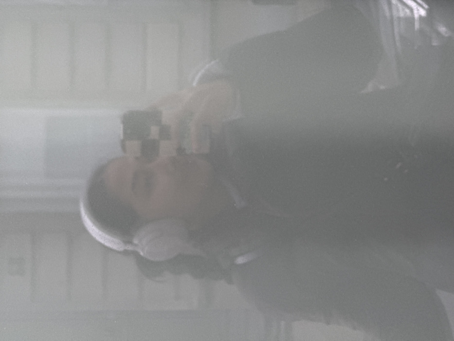 A self-portrait captured in Antwerp, Belgium, depicts an individual reflected in a surface, likely a mirror or window. The subject, with dark hair tied back, is wearing light-colored over-ear headphones and a dark-colored jacket or coat. The subject's right hand is visible holding a smartphone equipped with a distinctive black and white checkered case, positioned to photograph the reflection. The background behind the subject's reflection appears out of focus and indistinct, showing faint horizontal and vertical structural elements.