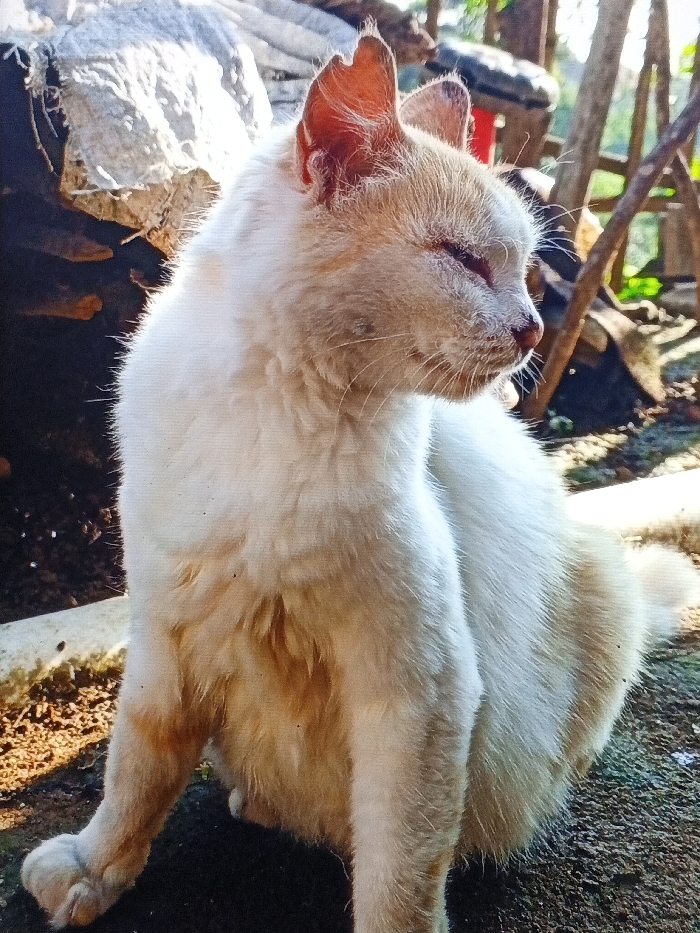 A light ginger and white cat sits upright outdoors. Its eyes are closed, and it faces to the right. The cat's fur is mostly white, with light ginger patches on its head, ears, and back. A pile of wood and material is behind the cat on the left. A glimpse of green foliage and wooden structures is visible in the blurred background on the right. Sunlight illuminates parts of the scene.
