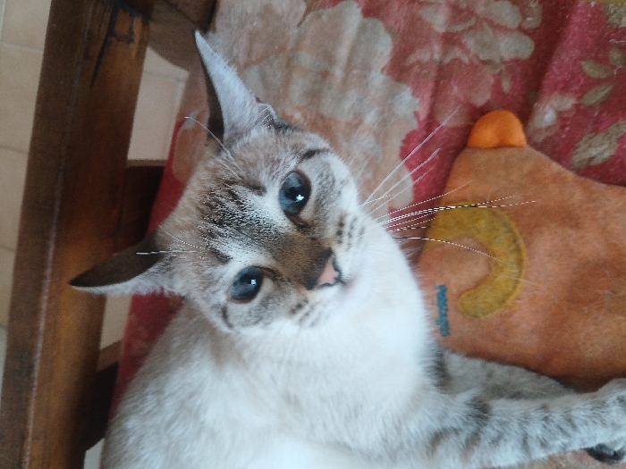 A domestic cat with Lynx Point coloration, characterized by light cream fur on the body and darker grey-brown fur on its face, ears, legs, and tail, is depicted lying down. The cat possesses striking blue eyes and a pink nose, with prominent white whiskers extending laterally. Its head is slightly tilted, and it is looking directly towards the viewer. The cat rests on a reddish-orange fabric featuring a faint floral or leafy pattern. Partially visible beneath the cat's chin and chest is an orange-brown soft object, possibly a toy or pillow, which exhibits a yellow crescent-shaped embroidery and a small, round orange protuberance on its right side. In the upper right background, a segment of a wooden furniture piece, consistent with a chair back, is visible. The scene is situated indoors, specifically in Ciudad Guayana, Venezuela.