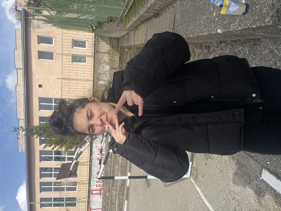 A young female subject is depicted outdoors on what appears to be a schoolyard or public sports ground within Cherven Bryag, Bulgaria