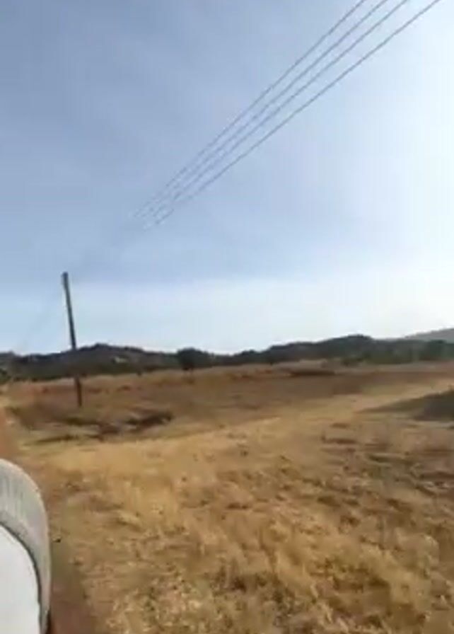 man riding a motorcycle on a dirt road. He wears a Jordan cap and sunglasses. The landscape is dry and grassy, with a few trees and hills in the distance. The sky is blue and clear. The man turns the camera to himself to show a smile. The wind is blowing strongly.