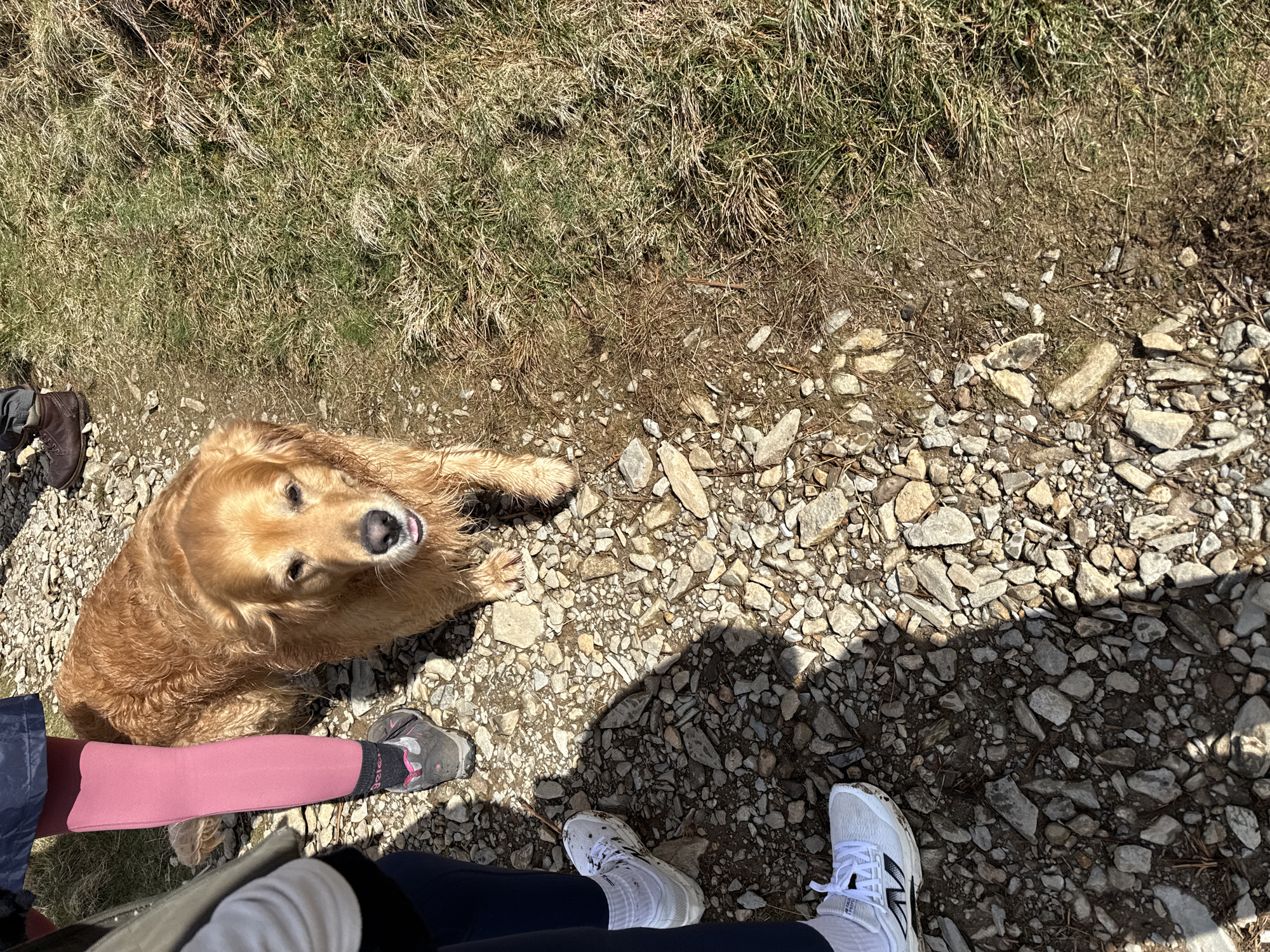 A wet golden retriever dog stands on a rocky trail in Grasmere, United Kingdom. The dog faces forward, its tongue slightly protruding. To the left, the lower legs and feet of two individuals are visible. One person wears dark blue leggings, white socks, and white athletic shoes. Another person wears pink leggings, a dark skirt, dark socks, and grey hiking boots. A dark brown hiking boot, presumably belonging to a third individual, is partially visible in the upper right background. The ground surface consists of a mixed-material path of irregular grey and brown rocks and dirt, bordered on the right by patches of dry, light green, and brown grass. Shadows from the individuals are cast upon the rocky path, indicating direct sunlight.