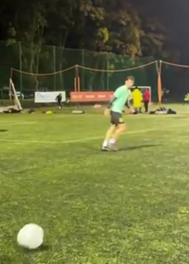 soccer game at night. A player in a light green shirt and black shorts stands near a white soccer ball on the green field. He runs toward the goal, and the camera follows. A player in a black and yellow jersey and white shorts runs behind him, as well as another player in similar attire. The goalkeeper, dressed in all black, stands ready at the goal. There are spectators in the background, and banners can be seen along the sidelines. The field is illuminated by bright overhead lights. Trees surround the field.