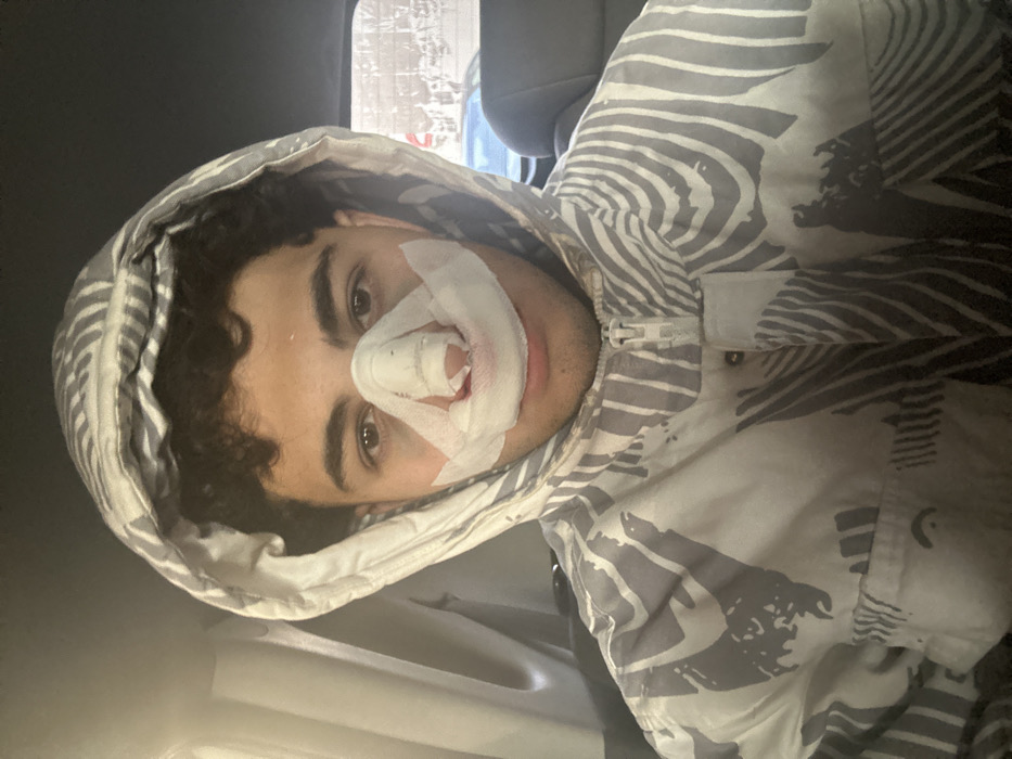The image displays a young male seated within the interior of a vehicle, located within Ash-Shaghour Municipality, Syria. The subject, exhibiting dark, curly hair, is wearing a white and grey patterned hooded jacket with the hood drawn over his head. His nose is visibly covered by a white nasal splint secured with white medical tape, with reddish discoloration, consistent with dried blood, observed around the nostrils and beneath the splint. The individual's eyes are open and directed towards the camera. The immediate background reveals the dark interior elements of the vehicle, including a seat structure. Through a window positioned to the right of the subject, a blurred outdoor urban environment is discernible, featuring indistinct building structures and the partial outline of a blue-grey vehicle.