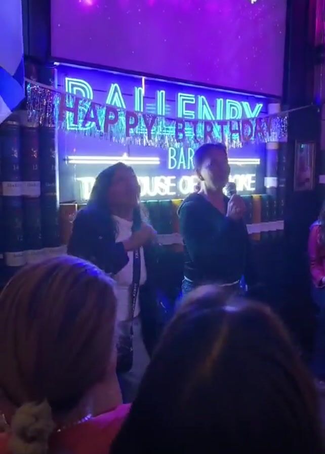 karaoke bar with several people enjoying themselves. A woman is singing into a microphone on a small stage area, with karaoke lyrics displayed on a screen behind her. Another woman stands next to her, cheering her on. In the background, a "Happy Birthday" sign is hung above the karaoke stage. To the side, two women are seated, with one looking at her phone and the other watching the singer. An American flag is hanging on the wall above them. Other people are visible in the background, some seated at tables and others standing, creating a lively and social atmosphere in the bar. The bar is decorated with various items, including what appears to be beverage cans, and the overall lighting is dim with a purple hue.