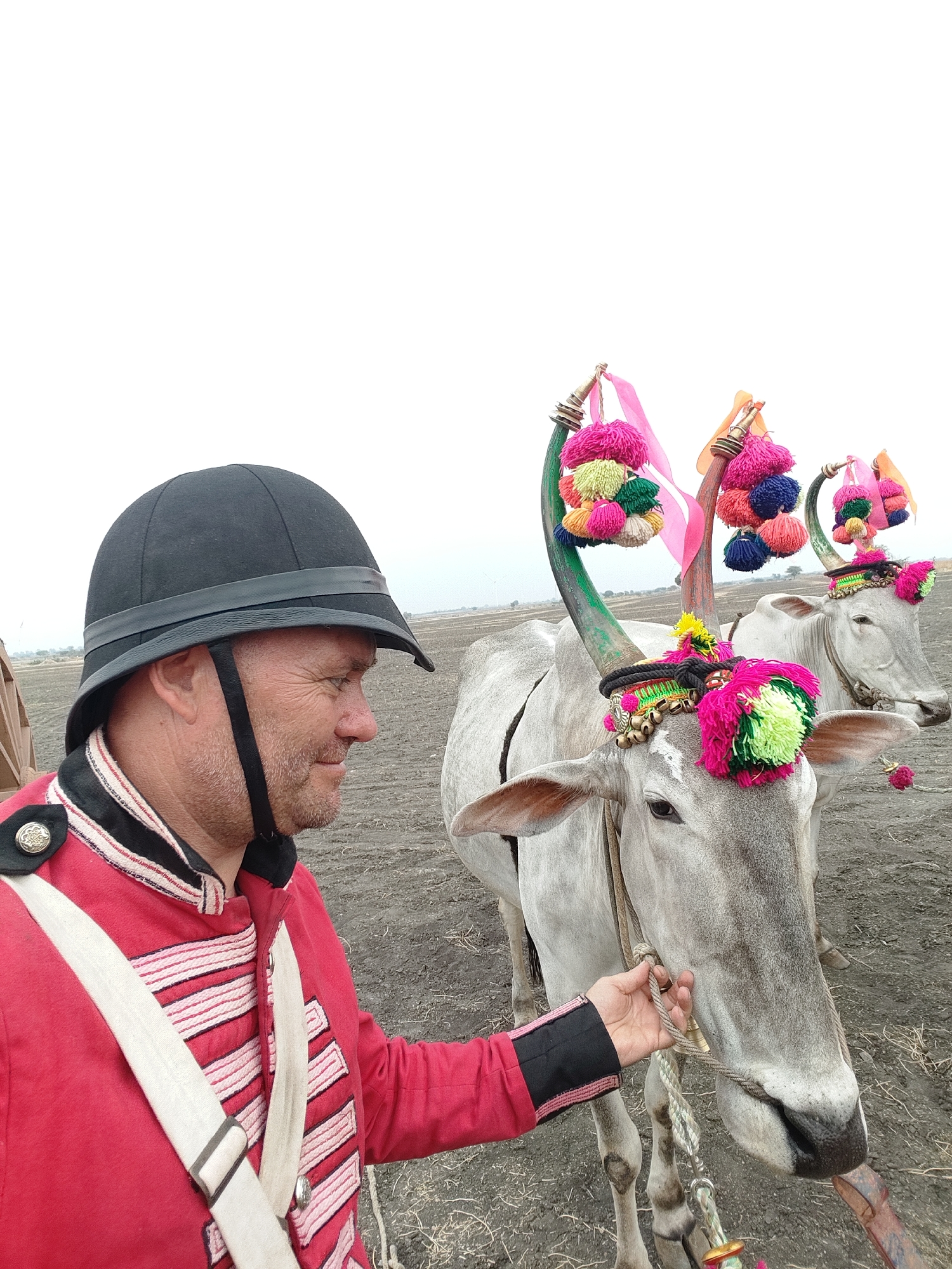 The image displays a male individual in historical military attire interacting with two elaborately decorated oxen in a dry, tilled field in Kottalapalli, India