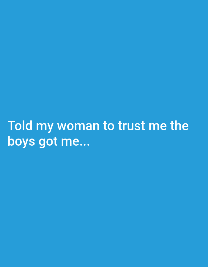 The image displays a solid, medium-blue background. White sans-serif text is centrally aligned in the lower-middle portion of the frame. The text reads across two lines: "Told my woman to trust me the boys got me...". No people, tangible objects, actions, interactions, or specific environmental features are depicted within the image. There are no visual indicators of a physical location, including the city of Ozark, United States.