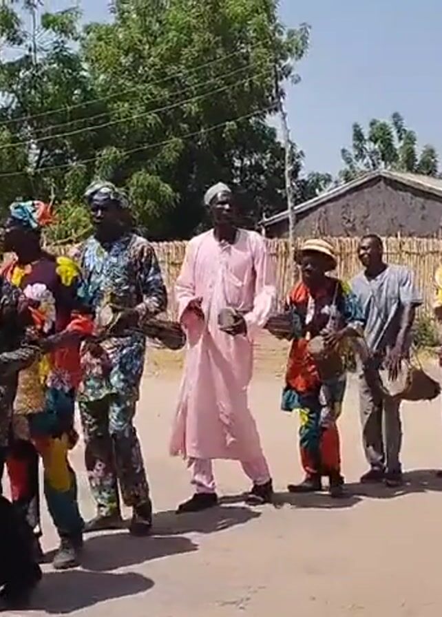 **Scene:** A bright, sunny day in a rural or semi-rural environment. **Environment:** A dirt road runs through a village. Buildings are visible in the background, including what appears to be a shack or basic dwelling with a corrugated metal roof and a fence made from woven reeds or branches. Trees are scattered throughout the scene, and a small hill is visible in the distance. A red SUV is parked to the side of the road. **People:** A group of approximately 15 people are processing along the road. The people are of African descent. **Subjects & Objects:** * Several individuals in the front of the procession are playing musical instruments. Instruments include drums, flutes, and horn-like instruments. The performers are wearing colorful, patterned clothing. * One individual is wearing a long, light pink robe. * The rest of the group seems to be following along. **Actions & Interactions:** The group is walking in a line, creating music. The camera follows them.