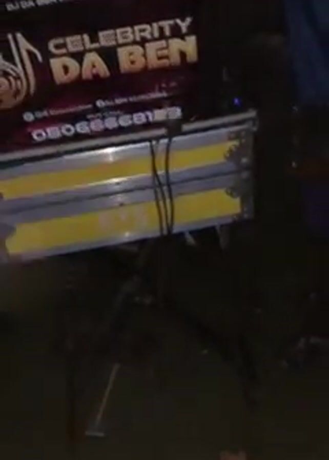 man with a Santa hat smiling and looking at the camera, standing in front of a DJ setup with a sign that reads "Celebrity Da Ben Entertainment." The DJ setup is on top of a yellow case. There is another man in an orange shirt standing nearby. Music is playing in the background.