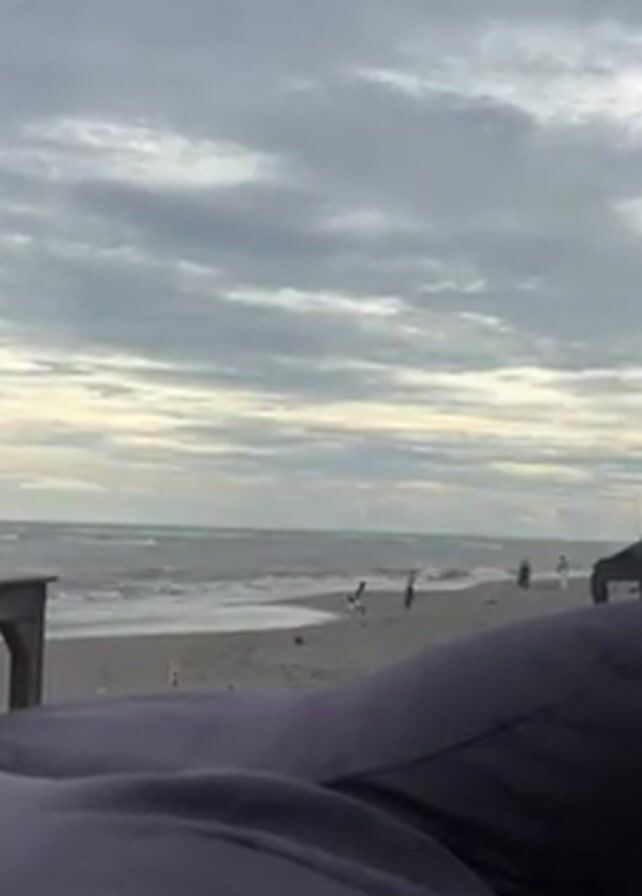 beach scene under a cloudy sky. The viewer's perspective is from a reclined position, likely on a beanbag or similar seat, as suggested by the visible dark blue or black fabric in the foreground. In the distance, the ocean waves roll onto the sandy shore. Several people are walking along the beach, some appearing to be playing with dogs. There is a wooden structure visible to the left side of the frame. Overall, the scene appears calm and relaxed despite the overcast weather.