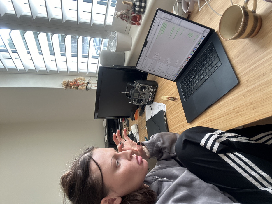 An individual, appearing female, with dark hair and wearing a grey hooded sweatshirt and black track pants with white stripes, is seated at a light-colored wooden desk in a room in Tunbridge Wells, United Kingdom