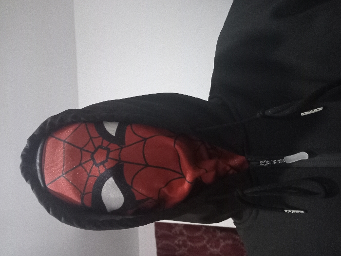 A black hoodie's hood is pulled up, revealing a red and black Spider-Man mask design on the hood's interior