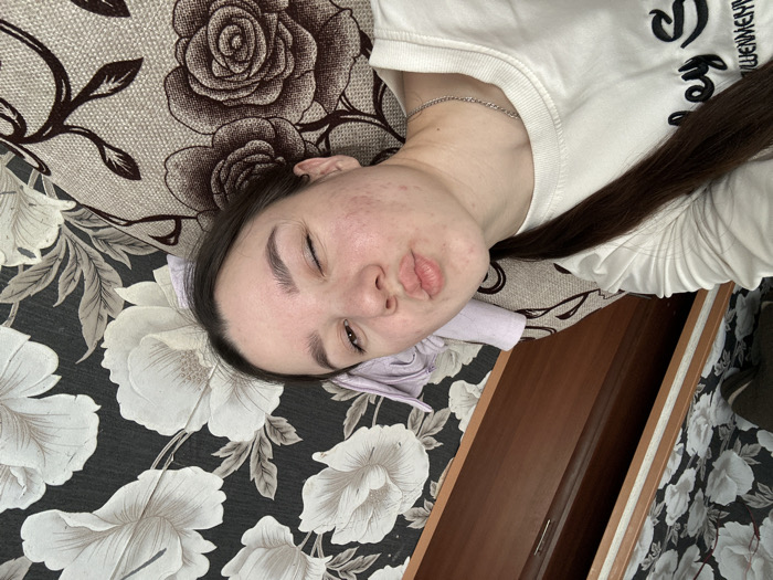 A young female subject is depicted in a close-up, diagonal portrait, likely a selfie, within an indoor residential setting in the city of Ольховка, Russia