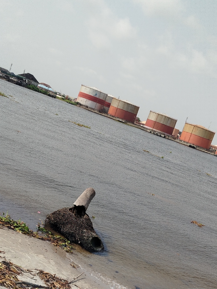 The scene depicts a shoreline along a body of water, likely a river or lagoon, within the city of Ibasa, Nigeria. In the foreground, a weathered, partially submerged log or tree stump rests at the water's edge on a sandy bank, surrounded by scattered organic debris and green aquatic vegetation. The log is dark-colored, with a broken, upright section and a hollowed-out base. The water itself exhibits minor surface ripples and contains floating patches of green vegetation. Across the water, on the opposing bank, an industrial facility is visible under a mostly clear sky with scattered light clouds. The dominant features of this facility are four large, cylindrical storage tanks. Each tank is painted with a distinctive horizontal pattern: a prominent red-brown band across the lower section and an off-white or cream band on the upper section. Circular blue logos are discernible on the upper sections of at least two of the tanks on the left. To the left of these tanks, further industrial elements are present, including a substantial dark pile, possibly coal or aggregate, and a tall, slender structure resembling a crane or communication tower. No individuals or active interactions are observed within the frame.