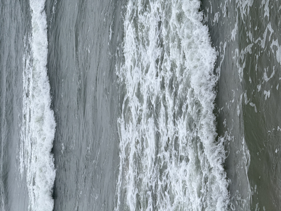 The image displays a detailed, vertical close-up of the Baltic Sea, off the coast of Zelenogradsk, Russia. The scene is entirely dominated by ocean waves, characterized by a palette of dark gray-green water and prominent white foam. Multiple parallel wave formations are visible, extending horizontally across the frame. In the upper-mid section, a distinct wave crests with a line of white foam. Further down, in the lower half of the image, a larger wave is breaking, creating a turbulent expanse of white froth and aerated water. The foreground also shows choppy water with scattered patches of foam. The water surface exhibits varying textures, from rippled dark areas to highly agitated, foamy sections. No land, sky, vessels, individuals, or man-made objects are present within the frame, focusing exclusively on the dynamic movement of the water under what appears to be an overcast sky.