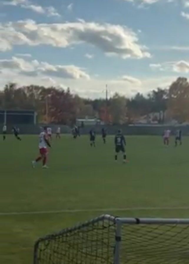 soccer match in progress on a grassy field on a sunny day with scattered clouds in the sky. Players in red and white uniforms are visible, along with players in black and white uniforms, running across the field. A referee in a green uniform is also present. The camera is positioned behind a soccer goal, and the net is visible in the foreground. Trees with autumn foliage line the perimeter of the field. A building is visible in the background.