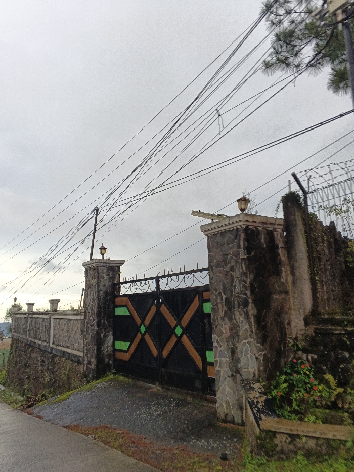 The image captures an exterior scene in Sindangjaya, Indonesia, under a uniform overcast sky. A dark, wet-appearing paved road ascends from the lower left foreground toward a gated property entrance. The central feature is a double-leaf wrought-iron gate, primarily black, detailed with a geometric pattern of intersecting diagonal lines in lime green and light brown. The gate is topped with decorative spikes. It is flanked by two robust pillars constructed from irregular grey and brown fieldstones. Each pillar is capped and supports an unlit, antique-style lantern fixture with a pointed top. A small, light-colored bird is perched on a wooden beam extending from the top of the right gate pillar. To the left of the gate, a matching stone wall extends horizontally, punctuated by smaller capped posts, each also topped with an unlit lantern fixture. This wall rests atop a vegetated earthen embankment. Beyond this wall, the terrain slopes downwards, revealing distant hills or a valley under the same sky. To the immediate right of the right gate pillar, an older, more heavily moss-covered stone wall section, topped with barbed wire, is visible. Small plants with red blossoms grow at its base. Numerous black utility wires crisscross the upper sky, supported by a dark, slender utility pole positioned to the left of the left gate pillar. A pine tree's branches are visible in the upper right quadrant. No human subjects are present in the scene.