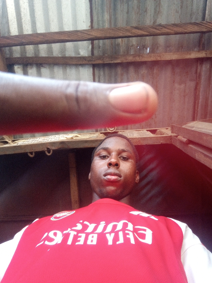 A low-angle, close-up photograph taken in Onitsha, Nigeria, captures a young Black male looking directly at the camera. He wears a red and white long-sleeved shirt with the text "Emirates FLY BETR" visible in reverse, along with an Arsenal Football Club crest on the chest. A blurred, dark-skinned finger occupies the upper foreground, partially obscuring the background. The background features a structure composed of corrugated metal sheeting and horizontal wooden beams. Below the beams, a wooden frame or shelf with metallic hooks is visible. To the right, a dark, hinged, box-like structure is present. The environment suggests an informal interior or sheltered outdoor space.