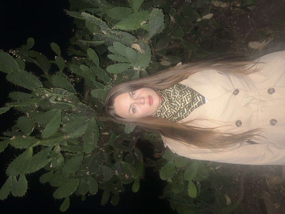 A solo female subject is depicted standing outdoors at night in Kamenovo, Montenegro. She faces the camera directly with a neutral expression. Her long, light brown hair is parted slightly off-center and falls over her shoulders. She wears a beige, double-breasted trench coat with dark buttons and a belt tied at the waist. A patterned scarf, primarily dark with a repeating light geometric design, is worn around her neck, beneath which a small portion of red fabric is visible. The immediate background consists of a large, dense Opuntia cactus (prickly pear) plant, characterized by numerous green, spiny pads. The letters "LDKD" are visibly carved or etched into one of the cactus pads in the upper left quadrant of the frame. The area beyond the subject and cactus is completely dark, indicative of nighttime conditions, with both the subject and the cactus illuminated by an artificial light source, likely a camera flash.
