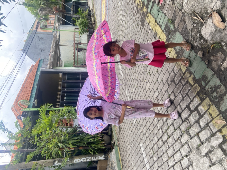 - "Two young girls hold open umbrellas on a brick sidewalk" by FM-htxI33, licensed under CC BY 4.0