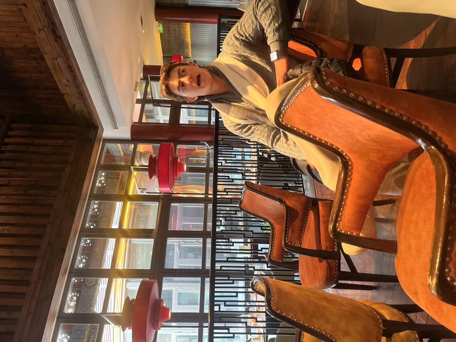 The image depicts an indoor scene within a modern establishment in Dongcheng District, China, possibly a restaurant or lounge, characterized by traditional Chinese architectural influences. In the immediate foreground, a young adult male with dark hair is seated in an orange velvet-upholstered armchair featuring dark wood trim and brass stud detailing. He wears a grey knitted sweater, a light beige scarf draped around his neck, and a dark garment across his lap. A silver smartwatch is visible on his left wrist. His mouth is open, suggesting he is mid-speech or reacting to something off-camera, with his gaze directed slightly to the right. To the left of the male, two similar armchairs are visible: one in a golden-orange hue, and another in a darker terracotta shade, both with matching stud and wood detailing. The room's interior features a high ceiling with exposed dark wooden beams and panels. Two large, tiered, red circular pendant lights with a traditional Asian design hang from the ceiling. A substantial wall of windows with dark frames occupies the background, revealing reflections of external traditional Chinese architecture, including intricate carved wooden elements and parts of a yellow-tiled roof. A dark metal railing with a geometric pattern runs horizontally across the mid-ground, separating the seating area from what appears to be another section of the establishment or an outdoor space. Red structural columns are also present, and in the distant background, a textured light-colored wall with brick-like patterns and an air conditioning vent are visible.