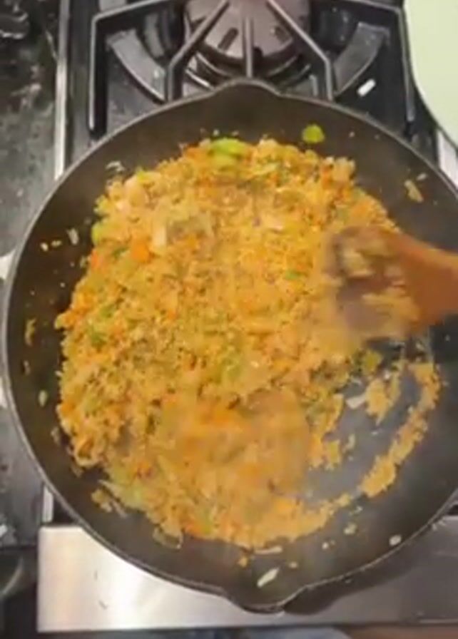 black cast iron skillet on a gas stovetop burner. Inside the skillet are chopped vegetables, mostly orange and green, being stirred with a wooden spoon. Steam is rising from the pan. A blurred light green plate is visible in the upper right corner of the frame. Below the stove, a person wearing blue jeans is partially visible. The countertop is dark gray with light speckles.