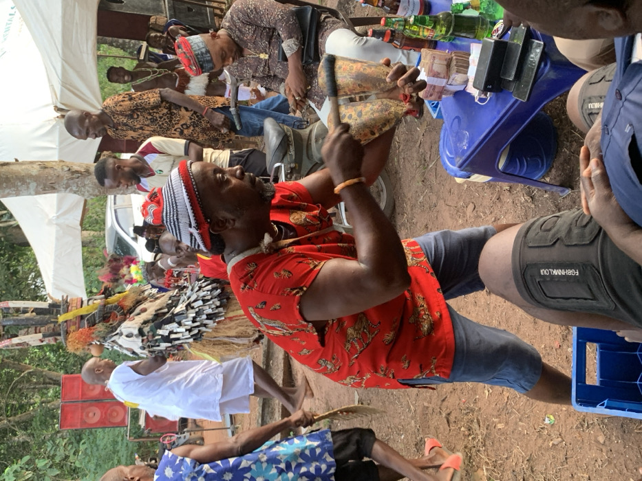 An outdoor gathering showcases cultural traditions. A man in a red patterned shirt and striped cap plays a percussion instrument. Another man wears a patterned robe and traditional red cap. Attendees are seated or standing, some in traditional attire. A masquerade figure is visible in the background. A table holds bottles and stacks of money. Speakers suggest music or announcements are part of the event.
