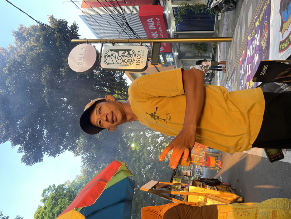 An outdoor, street-level scene in Kecamatan Pati, Indonesia, depicts a bustling commercial area under strong, warm sunlight. In the foreground, a mid-adult male with light skin and short dark hair wears a yellow t-shirt with a graphic of a stick figure and partial text "WE BEARD," a dark baseball cap with a tan brim, and dark pants. He stands facing slightly right, looking upwards and to the right with a neutral expression, holding his hands elevated in front of him, with an orange-hued item visible in his grasp, suggesting it is illuminated by the sun. To the left, a portion of a person wearing a brown headscarf and yellow patterned clothing stands near a street vendor's stall, which features a multi-colored umbrella (red, yellow, blue panels) and displays various items. Further down the street, additional stalls are visible, indicating a market setting. On the right side of the image, a gold-colored pole supports two illuminated signs: a circular sign at the top reads "SHEA Beauty Bar," and a rectangular sign below it reads "ISOIA Coffee & Bistro" with an accompanying graphic. Behind these signs, a building with horizontal siding features a red sign that reads "BANK INA Member of Salim Group" and a smaller "KBBank" sign. Numerous black electrical wires crisscross the upper right area. On the sidewalk in front of the building, two additional people are visible: an adult female with a white headscarf and a child in a pink top and green skirt. The sidewalk is covered with several large, colorful printed tarpaulins or banners, and a black folding chair with "Speeds" branding is positioned on one. A parked motorcycle is visible on the far right. The background features dense green foliage from large trees, with visible smoke or haze rising amongst them. The sky above is clear blue. The overall lighting is bright and directional, indicating late afternoon, casting long shadows and illuminating subjects with a golden-orange glow.