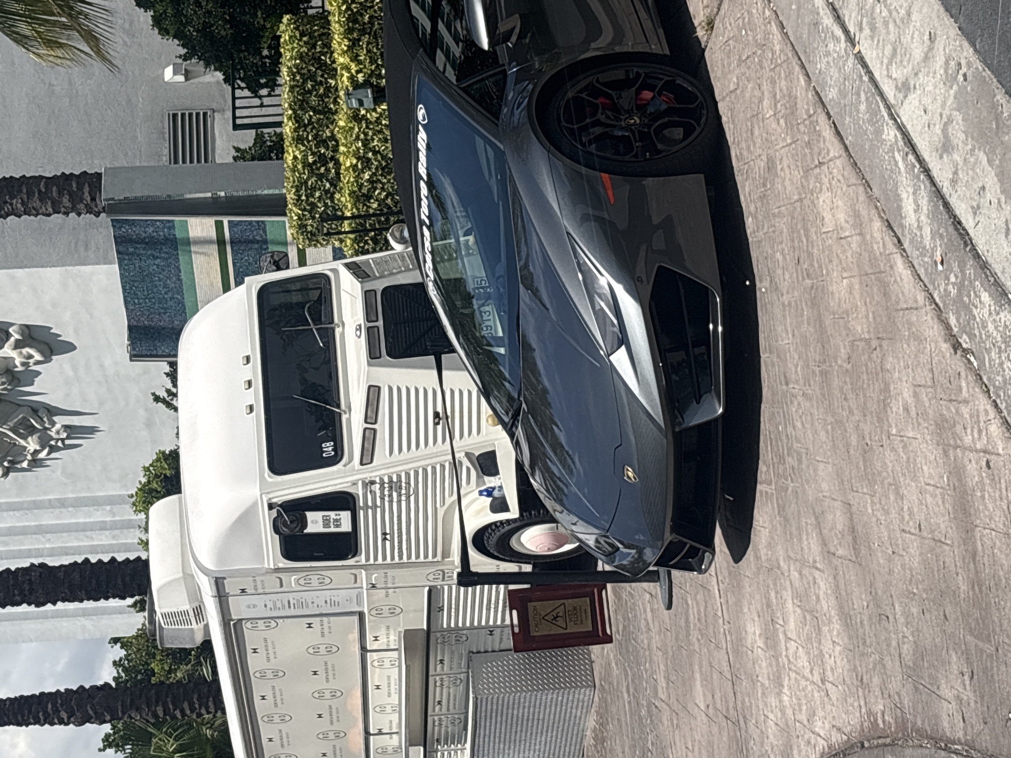 The scene shows a grey Lamborghini parked on a concrete street next to a white food truck