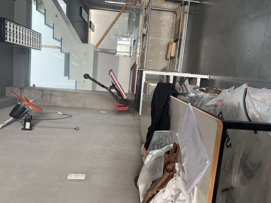 small workspace in a building located at 10.357 latitude, 107.08 longitude in Vung Tau, Vietnam. There is a large industrial heat press on a table next to a metal shelving unit. On the table are some clothes and a sheet of paper. The room has a grey tiled floor and concrete walls, and a fan is hanging from the ceiling. There are glass steps leading to an upper floor, and a wooden railing on the left side of the stairs. The room is empty, with no people present.