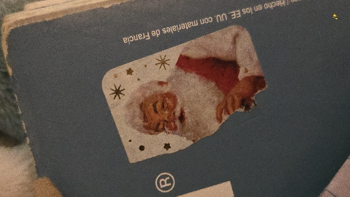 The image displays a close-up, angled view of a textured blue surface, possibly a book cover or notebook. Affixed to this surface is a roughly rectangular sticker featuring a depiction of Santa Claus. Santa is shown from the chest up, with a white beard, mustache, rosy cheeks, and wearing glasses. His eyes are closed or squinting in a smiling expression, and he is dressed in a red vest over a white shirt. His hands are visible at the bottom of the sticker, appearing clasped or resting. The sticker's white background is adorned with small gold or yellow star-like shapes and dots, and its edges appear somewhat irregular. To the left of the sticker, a registered trademark symbol (®) is partially visible. To the right of the sticker, oriented vertically and angled, partial text in Spanish reads: "Hecho en los EE. UU. con materiales de Francia" (Made in the U.S.A. with materials from France). The blue surface exhibits a fine, granular texture. Lighter-colored edges in the upper and bottom right corners suggest wear or the presence of underlying pages. The image does not contain any discernible visual information to establish its location in the city of Lompoc, United States.