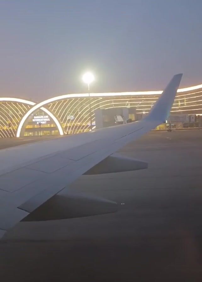 From the perspective of an airplane window, the wing of the plane is visible against the backdrop of the Samarkand International Airport