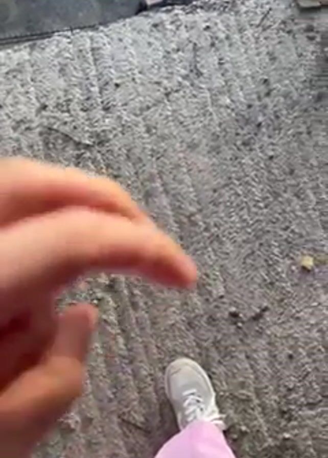 The video begins with a shot of a person standing on a gray concrete surface, wearing light pink pants and white sneakers