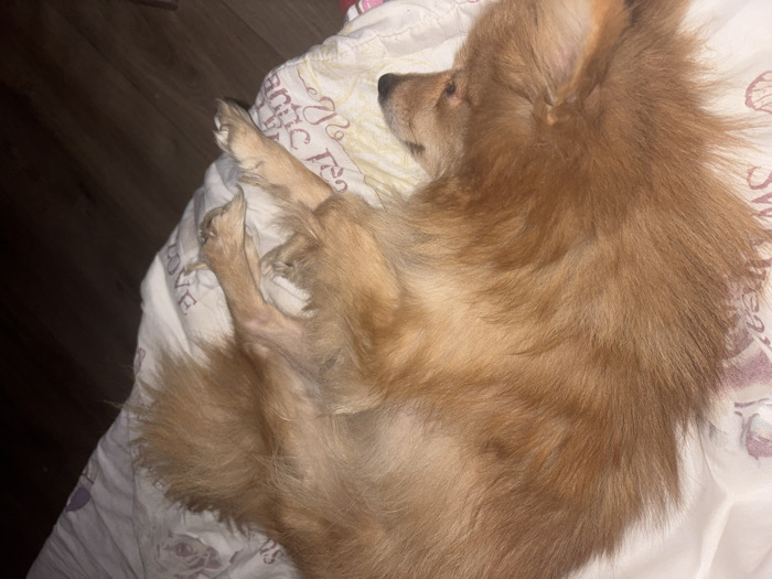 An indoor scene depicts a small domestic dog, likely a Pomeranian or similar Spitz-type breed, resting. The dog possesses light brown to ginger-colored fur and is curled on its right side, with its head oriented left, eyes closed, suggesting sleep or deep rest. Its pointed ears are visible, and its bushy tail is curled around its body. The animal rests upon a light-colored textile, possibly a blanket or bedding, which features subtle, faded patterns. A dark, likely wooden, surface is visible in the background to the left. The lighting is dim. No discernible information within the image indicates a specific location within the city of Krichim, Bulgaria.