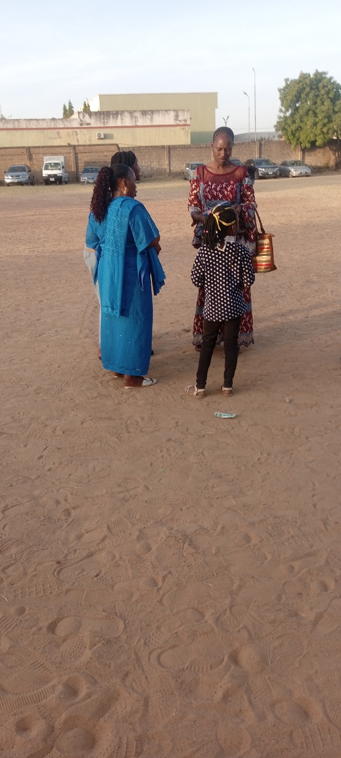 Three women and a child stand in a sandy area. The woman on the left wears a blue outfit. The middle woman wears a patterned dress and carries a bag. The child, facing away from the camera, wears a black and white polka dot shirt and black pants. Cars are parked near a wall in the background. A green tree is visible on the right.