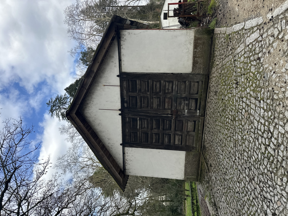 A single-story, gable-roofed building with white stucco walls and large, dark wooden double doors dominates the frame. Dark trim outlines the roof. A cobbled stone path extends from the building's side. Sparse trees and a cloudy sky are visible in the background. A second building with some metal machinery is visible further in the background.