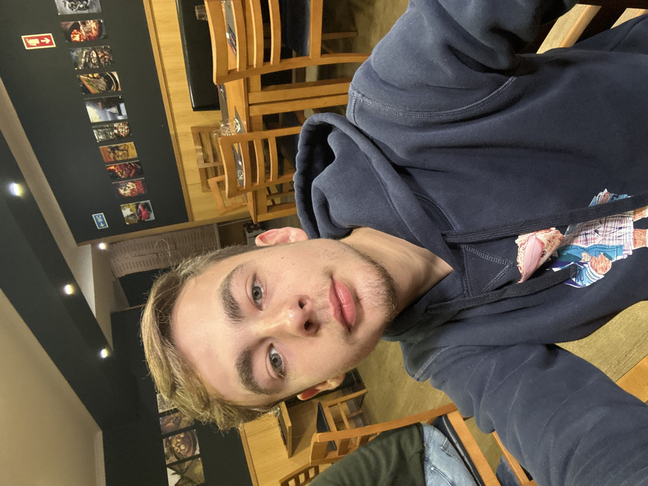 A young, light-skinned male subject, with short, light brown hair, light eyes, and minimal stubble on his chin and upper lip, is centered in the foreground, looking directly at the camera. He wears a dark blue hooded sweatshirt (hoodie) featuring a graphic of a bear in a hat and plaid clothing on the front. The scene is an indoor dining establishment, identified as being in Peso da Régua, Portugal, though no specific landmark or establishment name is visible. The background features multiple light wooden tables and matching chairs, some set with dark placemats, glasses, and cutlery. The walls are segmented, with a dark upper section and light wooden paneling below. Several framed pictures, depicting various subjects or food items, are mounted on the dark wall. A white sign with a blue arrow pointing left and a toilet symbol (WC) is visible on the dark wall, along with a red sign featuring a downward arrow. Recessed spotlights in the ceiling provide illumination. To the left, a second individual is partially visible from the back, seated at a table, wearing a dark top and blue jeans.