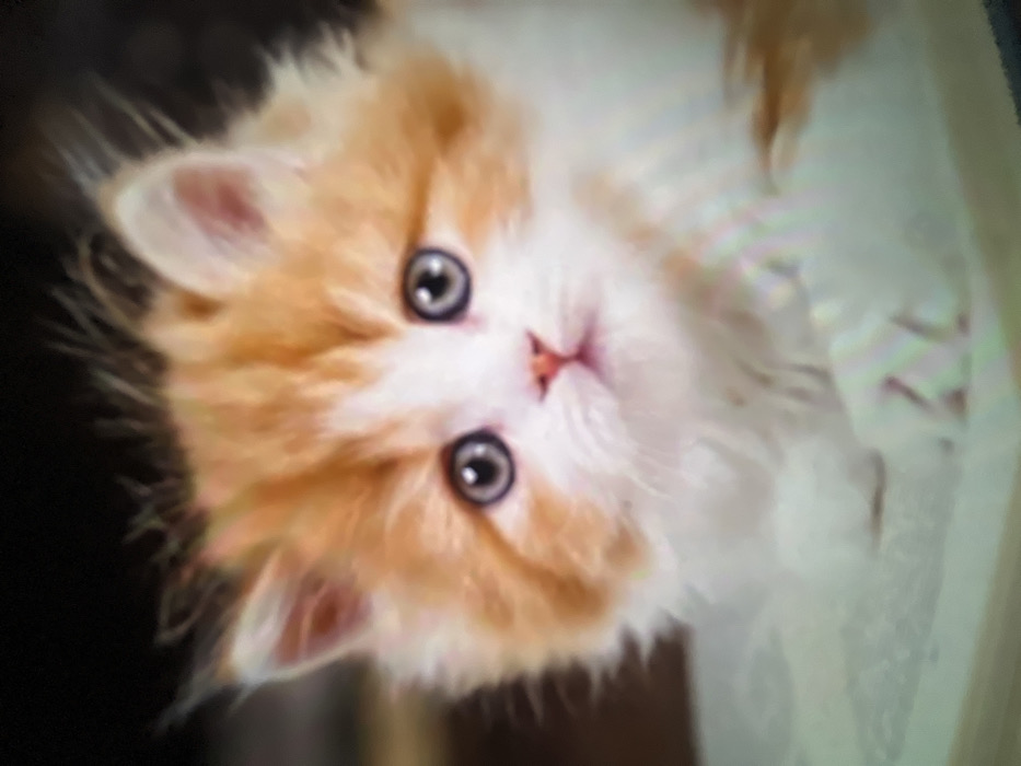 A fluffy kitten with striking blue eyes, is captured head-on. Its fur is a blend of white and orange, framing a small pink nose and endearing expression. The kitten's fluffy ears and soft fur are reminiscent of a Persian breed. The background is blurred, drawing attention to the kitten's captivating gaze and playful charm.