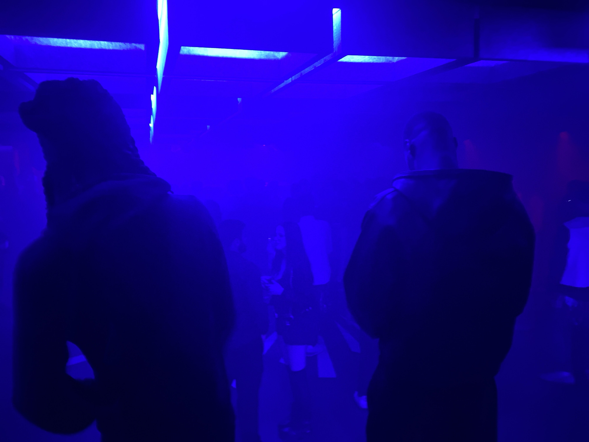 The scene depicts the interior of a nightclub or entertainment venue in Paris, France, permeated by deep blue lighting and atmospheric haze. In the foreground, two individuals are silhouetted from behind, facing away from the viewer. The person on the left wears a dark, indistinct garment, possibly hooded, obscuring specific features. The person on the right also wears a dark, possibly hooded garment, with their head and upper torso rendered in silhouette. Multiple additional indistinct human figures are visible in the midground and background, partially obscured by the blue illumination and haze. One central midground figure, appearing female, is dressed in dark clothing and holds an indeterminate object. Overhead, linear light fixtures emit brighter blue light. Faint geometric patterns are discernible on the floor surface. The environment is consistent with a social gathering.