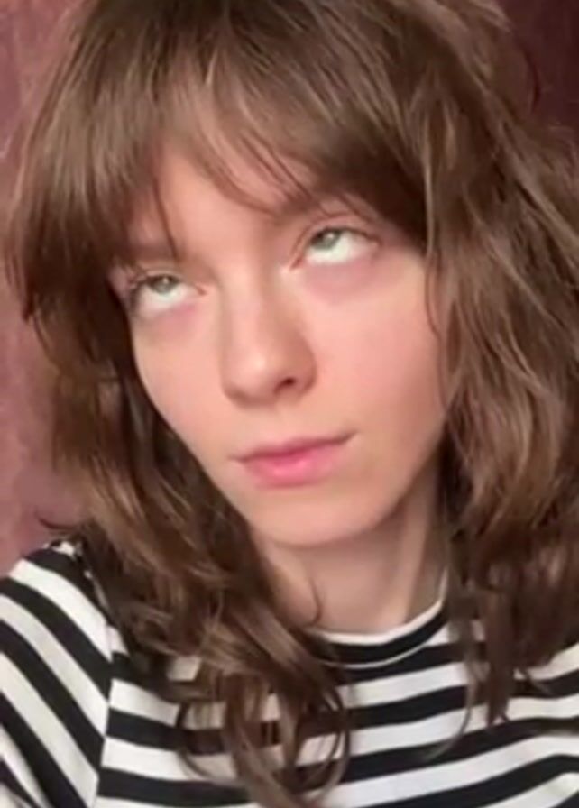 A woman with brown hair and bangs is wearing a black and white striped shirt. She rolls her eyes upward. The background is a reddish-brown wall.