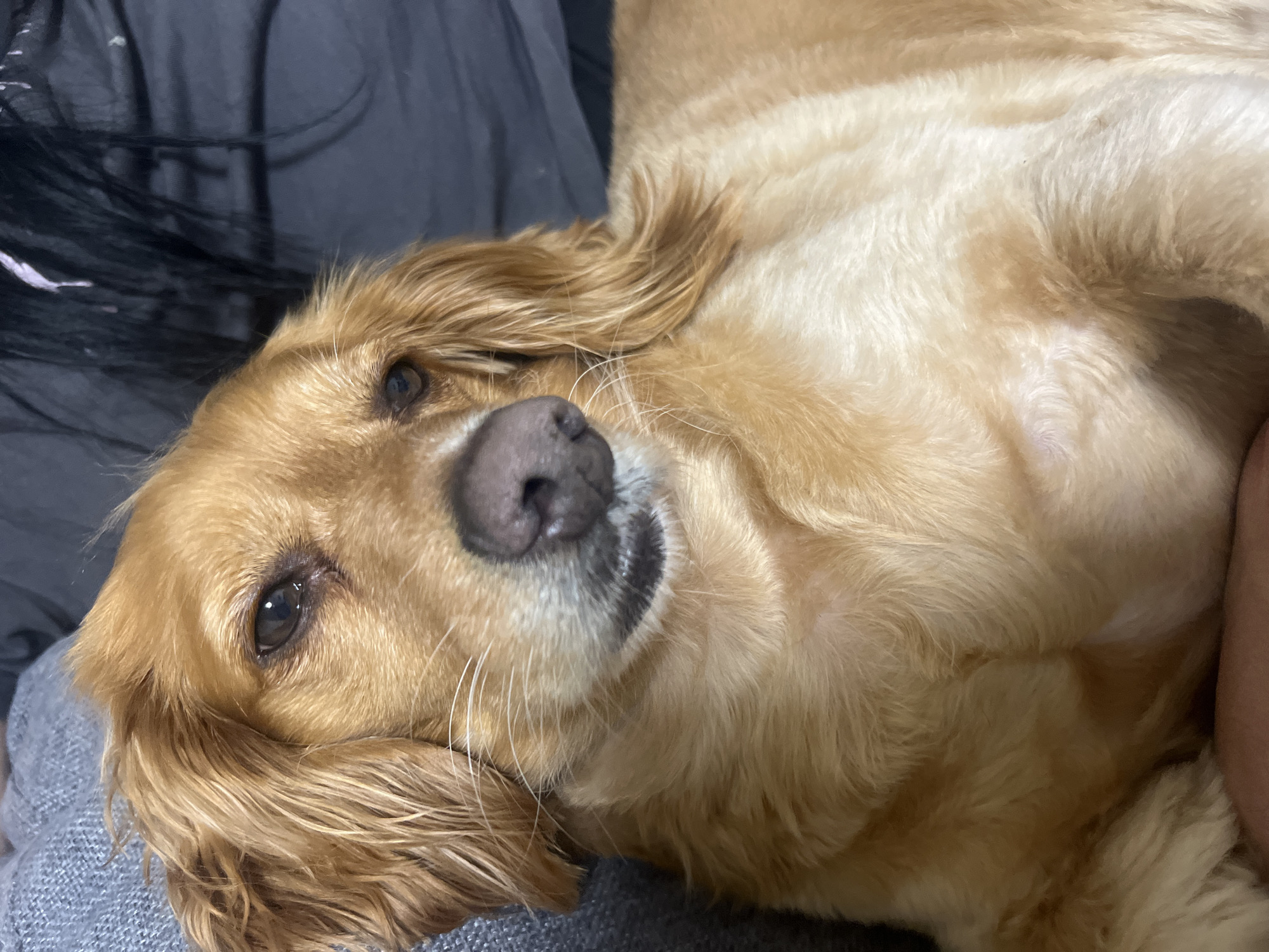 A light brown, long-haired dog, resembling a Cocker Spaniel or similar breed, is depicted in a close-up, medium-shot portrait. The dog's head occupies the central and upper left portions of the frame, with its body extending towards the lower right. Its fur is a consistent golden-reddish hue, with slightly lighter tones on its underside and around the muzzle. The dog's dark brown eyes are partially closed, conveying a relaxed or sleepy demeanor. A dark pinkish-brown nose and prominent white whiskers are visible. Its long, wavy ears frame its face. The dog is positioned indoors, likely resting on soft furnishings. A textured grey fabric, possibly a blanket, cushion, or upholstered furniture, supports the dog's head and is visible behind its upper back. In the upper right background, a segment of dark, long human hair is visible, suggesting the presence of an individual close to the dog. A portion of a human leg, with light-brown skin, is visible at the bottom right, beneath the dog's chest and belly, indicating the dog is resting on a person's lap or close beside them. The overall scene suggests a domestic, tranquil environment. No specific architectural features or geographical landmarks are discernible to identify a precise location within Shumen, Bulgaria.