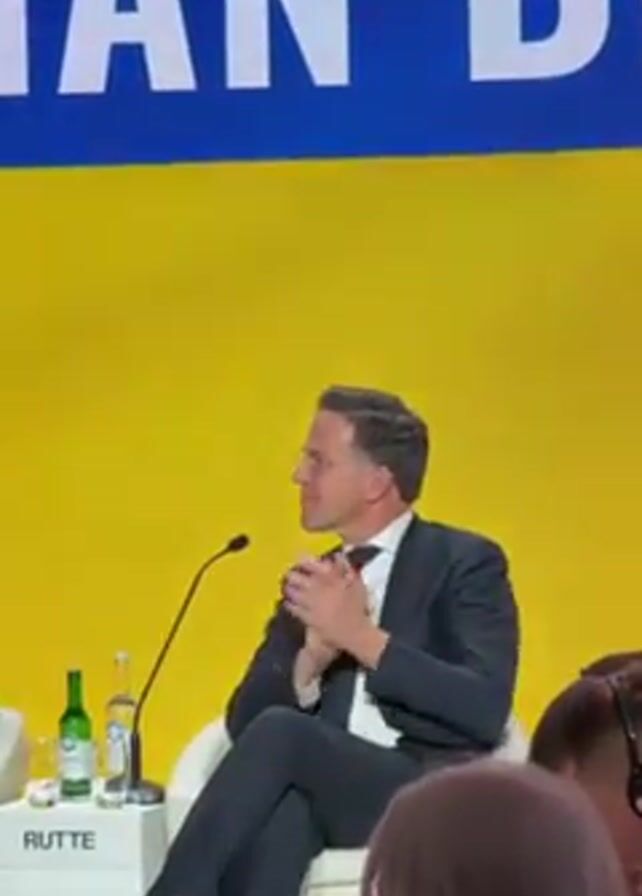 Dutch Prime Minister Mark Rutte sitting on a white chair on a stage with a yellow backdrop. He is wearing a dark suit, a white shirt, and a dark tie, and he has his hands clasped in front of him. He is facing slightly to the left and smiling. There is a microphone in front of him, and a water bottle on a small table to his left. There is another person sitting to his left who is only partially visible, and another person to his right with headphones. The name "RUTTE" is displayed on the table in front of the Prime Minister. A blue and white sign with the words "IAN BE" is visible above the yellow background. There is applause after the Prime Minister says "Thank you. Thank you so much".