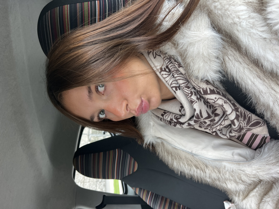 A young adult female with long brown hair and light eyes is centered in the foreground, positioned inside the passenger compartment of a vehicle. She is looking directly at the camera with her lips pursed. She wears an unzipped off-white faux fur coat over a beige scarf with a dark brown intricate pattern; a segment of the scarf also exhibits pink and brown stripes. The vehicle's light grey ceiling is visible overhead. Behind her, the back of a car seat features a dark base and a headrest with horizontal multi-colored stripes in brown, orange, red, green, and black. Through the vehicle's window, out-of-focus green foliage and a light-colored structure are discernible in the background, indicating an outdoor daytime scene. The location is Marseille, France.