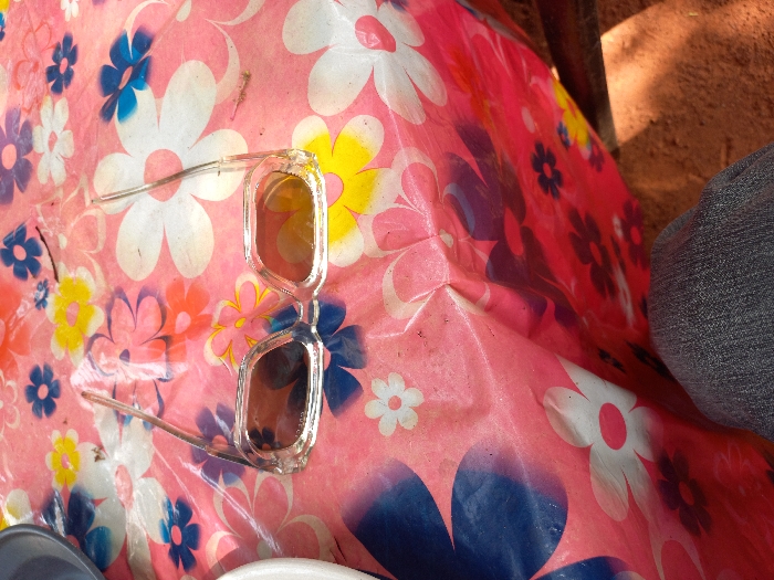 A pair of clear-framed sunglasses with amber-tinted lenses rests on a pink plastic tablecloth patterned with white, blue, and yellow flowers. The tablecloth exhibits creases and minor debris. A partial view of a light blue-grey bowl is visible in the upper left. In the lower portion of the image, a leg clad in grey denim jeans is present, indicating a seated individual. Below the table, a segment of sunlit reddish-brown earth or dirt ground is visible. The scene is located in the city of Oturkpo, Nigeria, depicting an outdoor or semi-outdoor environment under natural light.