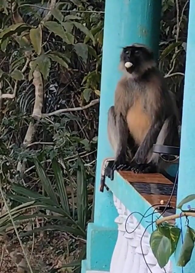 - "gray langur monkey perched on a teal-colored balcony railing" by FM-yj6ly1, licensed under CC BY 4.0